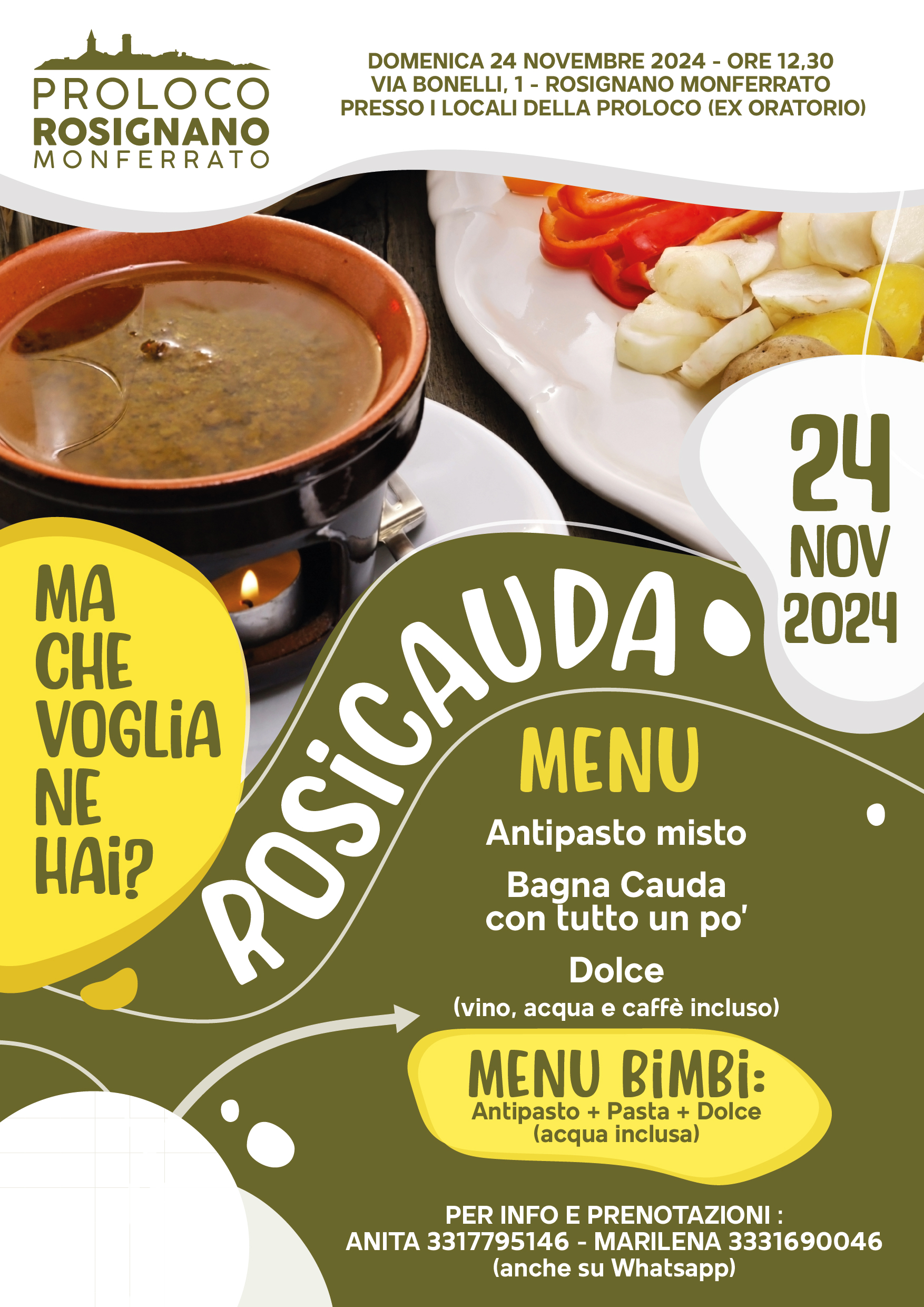 Un appuntamento da non perdere per gli amanti della bagna cauda. La ProLoco di Rosignano Monferrato per il pranzo di domenica 24 novembre propone "Rosicauda", dove protagonista è il piatto tradizionale nei mesi autunnali ed invernali dell'enogastronomia piemontese. La bagna cauda è un intingolo a base di acciughe, aglio e olio, servita nei tipici fujot che la mantengono calda mentre viene gustata e consumata con il pinzimonio prevalentemente di verdure di stagione.