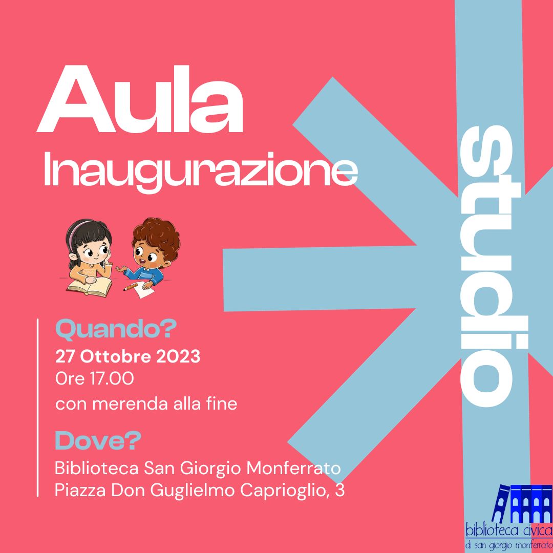 Venerdì 27 ottobre, alle 17, presso i locali della Biblioteca Civica di San Giorgio Monferrato (piazza Don Guglielmo Caprioglio, n. 3) si terrà l’inaugurazione dell’Aula Studio, progetto finalizzato alla creazione di un luogo confortevole, accogliente e dinamico, dotato di nuova cancelleria, di tre postazioni computer e di wi-fi gratuitamente accessibile presso il quale le studentesse e gli studenti e le ricercatrici e i ricercatori possono recarsi a studiare e a svolgere le proprie attività di ricerca e di approfondimento.