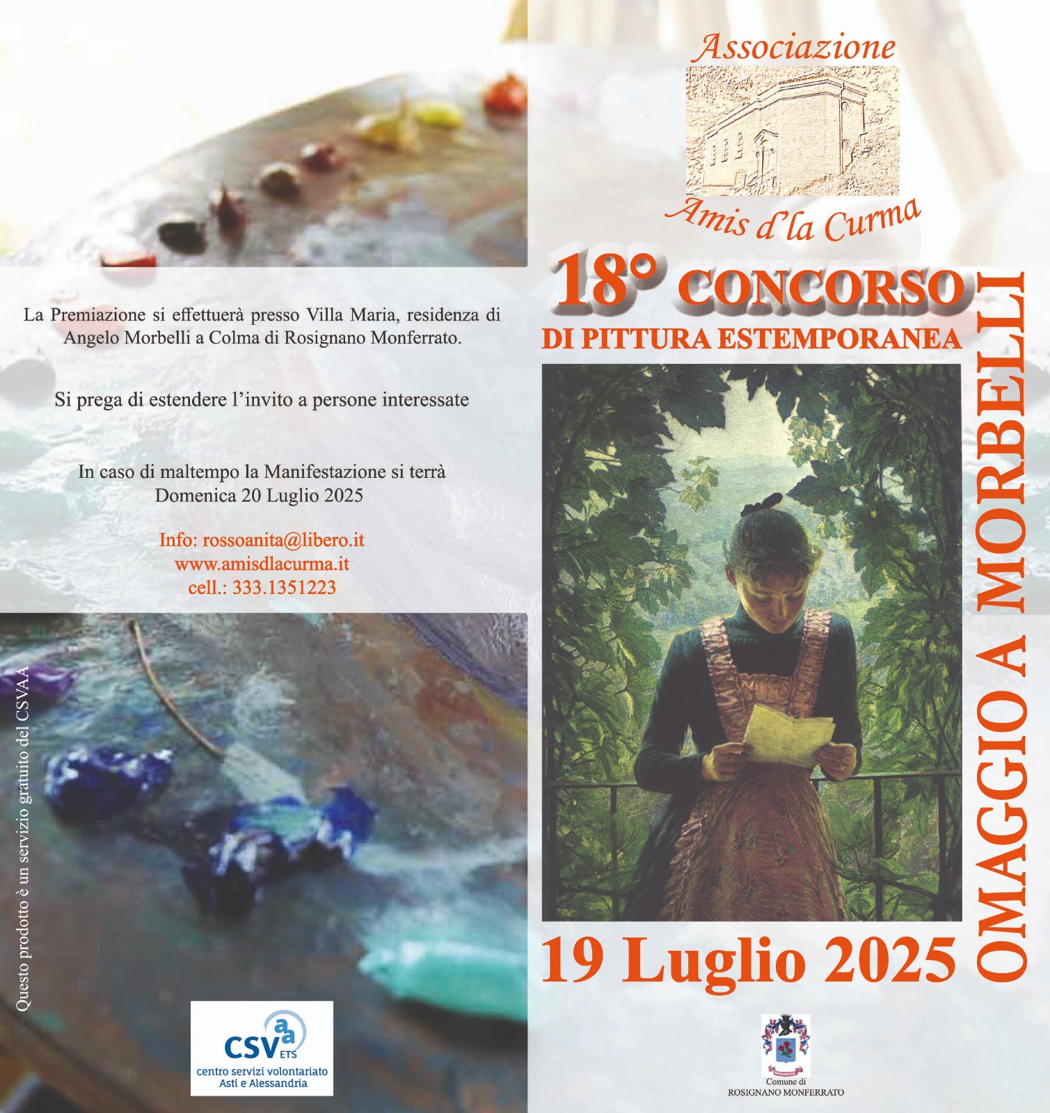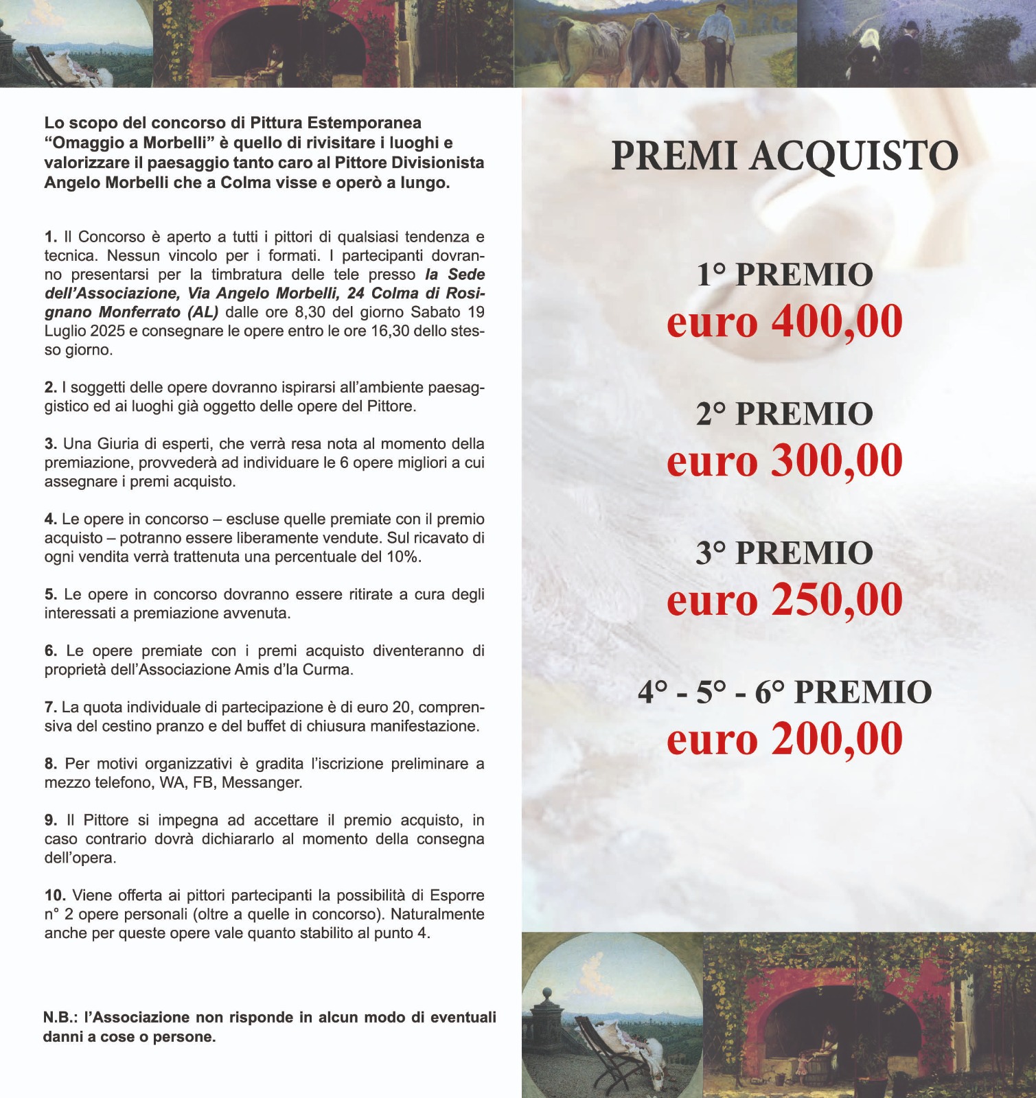 Sabato 19 luglio torna il Concorso di Pittura Estemporanea "Omaggio a Morbelli", il cui scopo è quello di rivisitare i luoghi e valorizzare il paesaggio tanto caro al Pittore Divisionista Angelo Morbelli che a Colma visse ed operò a lungo.