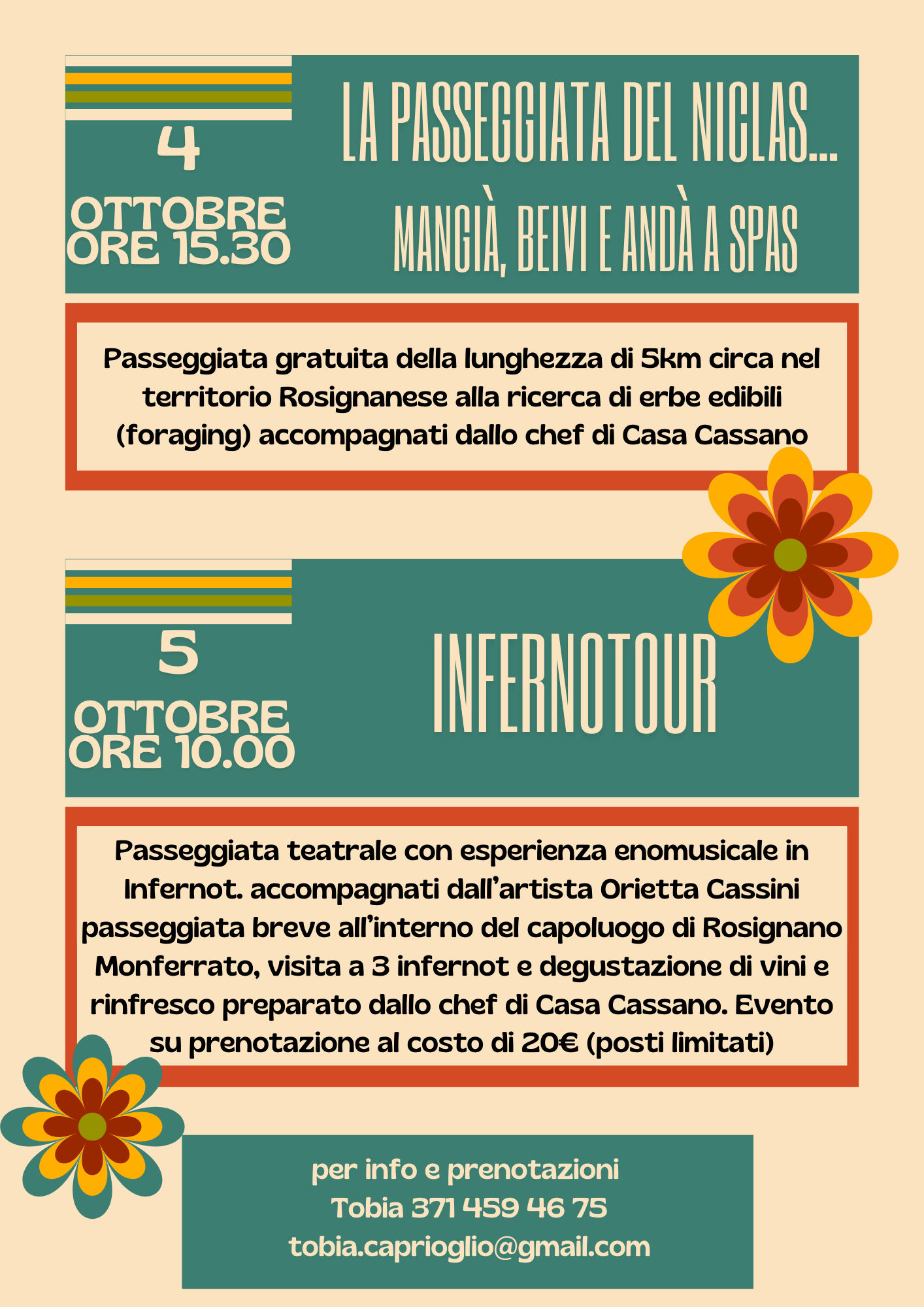 Info e prenotazione al numero 371 4594675 (si rimanda alla locandina dedicata)