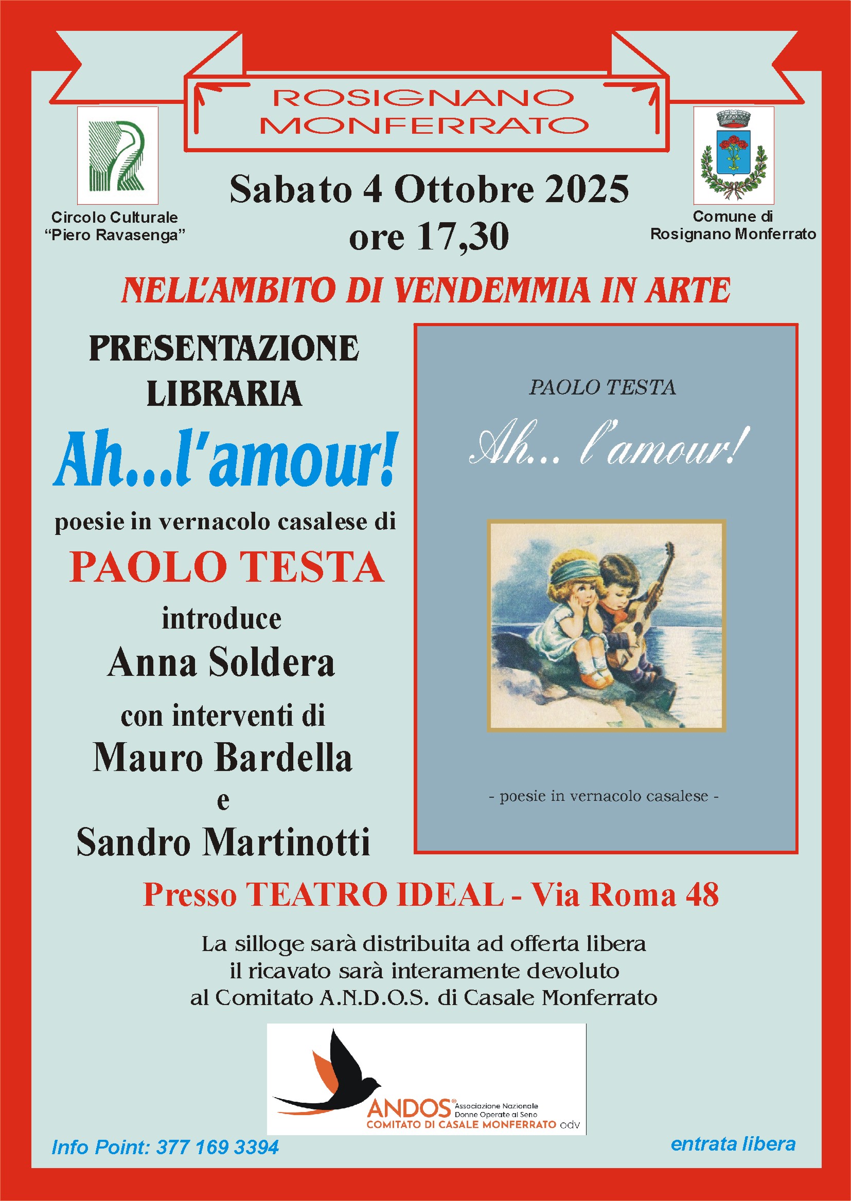 Il Circolo Culturale Ravasenga di Casale col patrocinio del Comune di Rosignano Monferrato, in collaborazione al Comitato A.N.D.O.S. di Casale Monferrato e con gli interventi di Mauro Bardella e Sandro Martinotti presenta la silloge di poesie in vernacolo casalese di Paolo Testa “Ah… l’amour!”. La pubblicazione raccoglie una trentina di poesie dell’autore casalese che hanno come filo conduttore il tema dell’amore nelle sue varie forme di amore romantico, ma anche di passione per il proprio territorio e per la gente di Monferrato. Alcune di queste poesie sono già state pubblicate all’interno di precedenti raccolte, altre sono state lette ma mai pubblicate, altre ancora sono inediti. Una bella raccolta tratta da un’ampia produzione, quella di Paolo Testa, che è stata sempre condivisa con il pubblico in tante occasioni di spettacolo e lettura. E il pubblico ha sempre risposto con entusiasmo, perché la poesia di Testa parla direttamente all’anima monferrina della gente di questa terra e, come succede sempre quando si tratta del dialetto, questo sussurrare ai sentimenti si veste di una valenza letteraria importante, come molti scrittori famosi hanno sempre affermato riferendosi all’uso del vernacolo in letteratura. Ogni territorio affonda le radici del linguaggio nel dialetto che si fa custode di termini e modi di dire pilastro di un impianto linguistico affinato dal passare del tempo. Chi fa scrittura usando il vernacolo in maniera autentica si riconosce immediatamente: la traduzione mera in dialetto (e viceversa) fa perdere immediatamente il senso poetico: la rima, di cui fa ampio uso Testa nei suoi versi, diventa così la prova evidente di come il gioco stilistico non sarebbe mai possibile se non nascesse pensato in dialetto. In questo discorso si colloca anche la posizione di Testa che tende a non riconoscere un’unica lingua piemontese, ma piuttosto quel mosaico di dialetti ognuno dei quali rappresenta uno scampolo di territorio con quelle tipicità che non devono perdersi e che lo contraddistinguono come sfumature di colore. Come a dire che la cultura di un luogo passa obbligatoriamente attraverso la sua parlata e le sillogi poetiche come quella di Testa ne resteranno a testimonianza per costruire l’identità di questo popolo. Di fatto l’autore ha alle spalle un’ampia produzione fatta di pubblicazioni e riconoscimenti: in vernacolo ha pubblicato le raccolte di poesie “Quaich surìs ant al magon” (1982), “La to vus” (2002, con prefazione di Bruno Gambarotta) e “Puesij sbardlaj” (2022); nel 2013 ha dato alle stampe “L’Arsetàri dla Granda” - ricette scelte, raccolte o carpite dalla tradizione popolare contadina - e in questo 2025 l'ultima sua antologia "Ah...l'amour!". In lingua italiana ha pubblicato nel 1990 “Viaggio attraverso i secoli tra leggenda, cronaca e poesia”; per i ragazzi “Filastrali - filastrocche di animali” (2007). Nel Centenario dell’Unità d’Italia il racconto “Quel sabato di fine marzo” ispirato alla Difesa di Casale del 1849 . Nel 2015, in occasione del 70° della Liberazione, ha dato alle stampe il racconto “Una nota di colore”. Nel 2018 la raccolta di favole “L’uva del