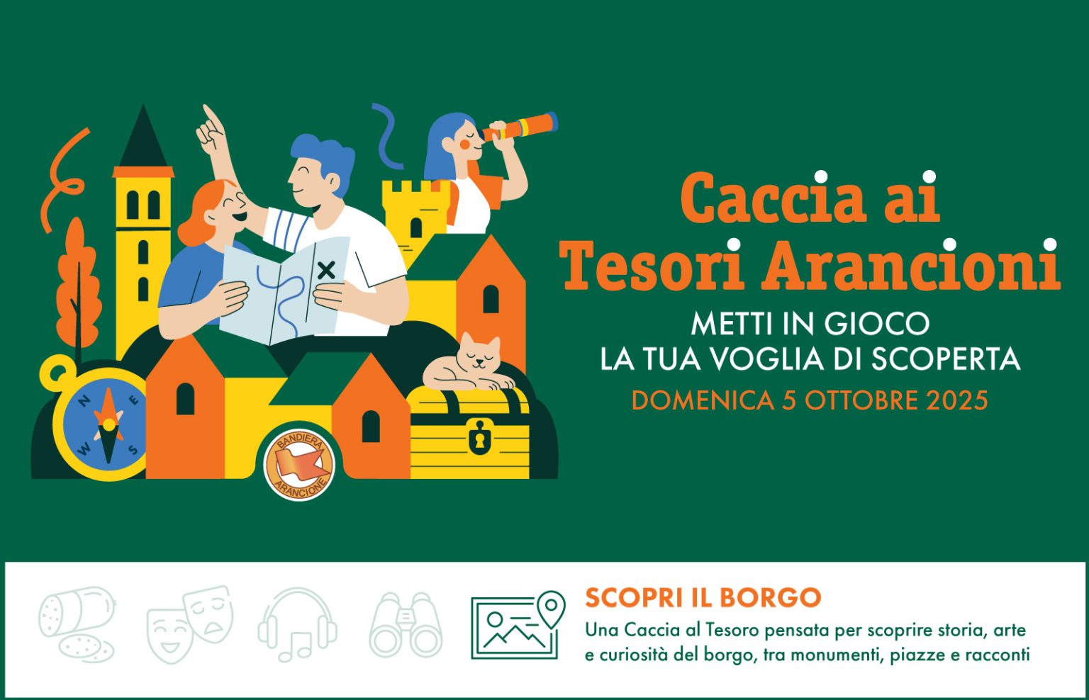 L'evento del Touring Club Italiano si svolge contemporaneamente in tutta Italia domenica 5 ottobre 2025, per scoprire i borghi certificati con la Bandiera Arancione aderenti all'iniziativa.