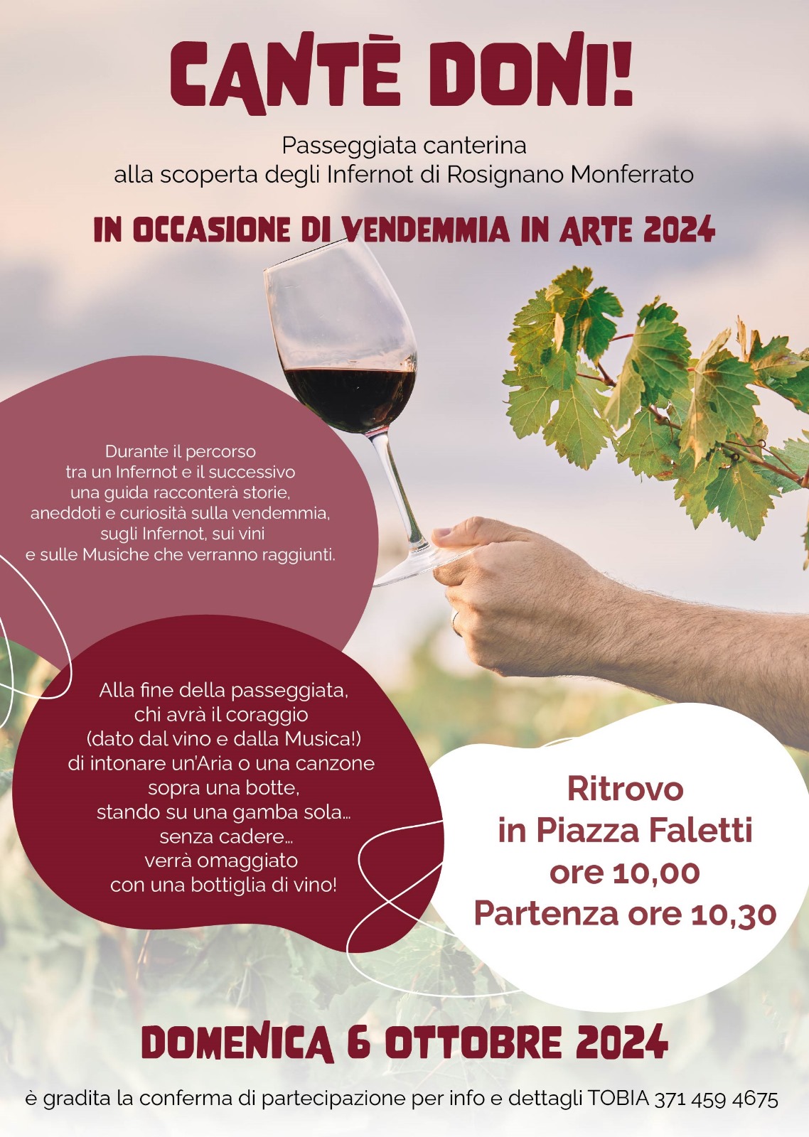 Il ritrovo è alle ore 10 in piazza Faletti, con partenza alle ore 10:30. “Canté doni..!” - “Cantate donne” - diceva il padrone alle vendemmiatrici esortandole a cantare, tenendo occupata la bocca, affinché non mangiassero l’uva. Il canto e il vino sono sempre stati un’unione quasi indissolubile: “Beiv che po’ at canti”, “al vin al fa cantà” quasi come se il vino, disinibendoci, accendesse il nostro istinto innato di esprimere le nostre emozioni con il canto! E lo sanno bene i musicisti che hanno scritto dei veri e propri inni al vino e ai brindisi! “Libiamo nei lieti calici”, “Barbera e Champagne”… Chi non li ha mai sentiti e magari pure canticchiati..?