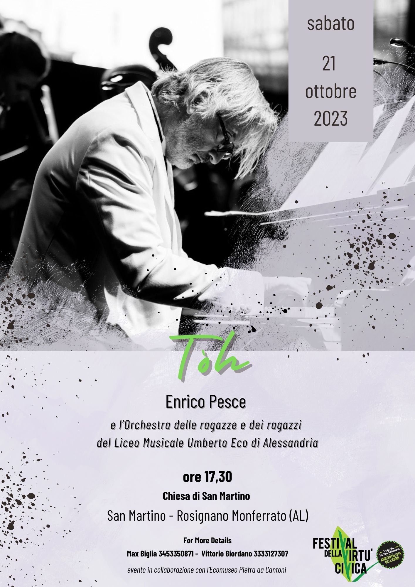 Sabato 21 ottobre è in programma il concerto con Enrico Pesce e l'Orchestra delle ragazze e dei ragazzi del Liceo Musicale Umberto Eco di Alessandria, alle ore 17:30 presso la Chiesa di San Martino.