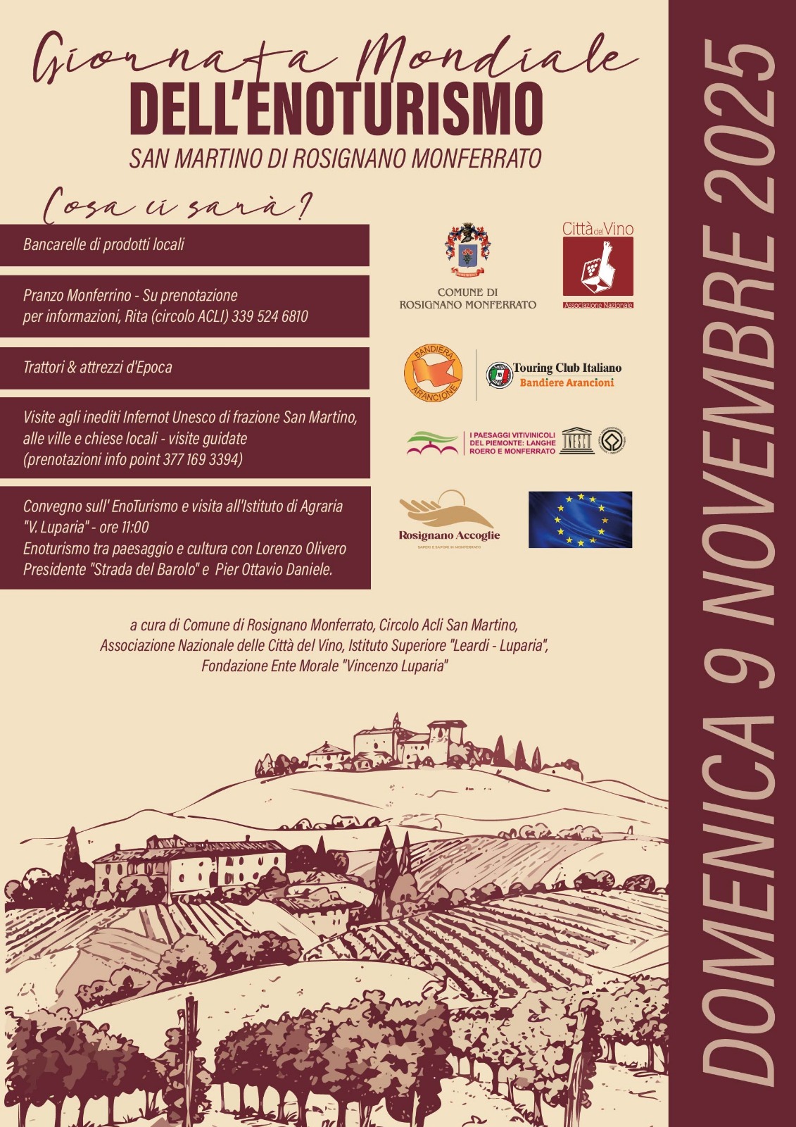 Domenica 9 novembre la frazione San Martino di Rosignano Monferrato in occasione della Giornata Mondiale dell’Enoturismo ospita un evento di respiro europeo promosso da RECEVIN - la Rete Europea delle Città del Vino, in collaborazione con tutte le Associazioni Nazionali delle Città del Vino.