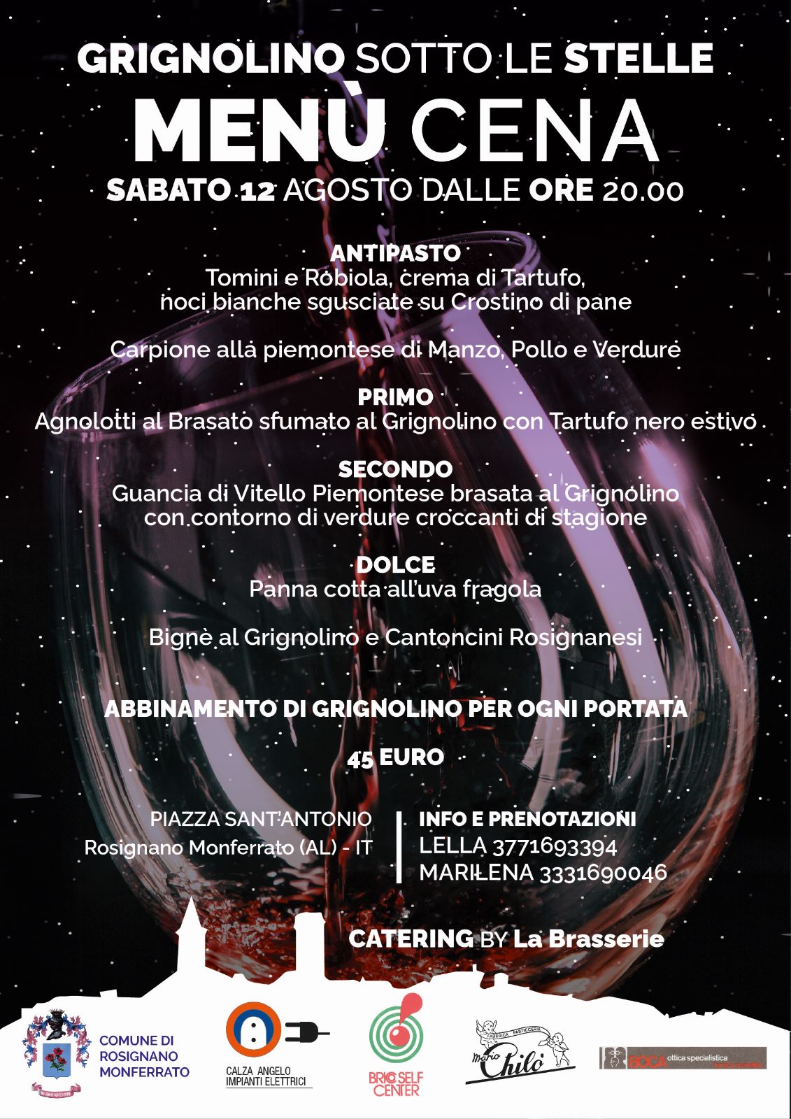 Come da tradizione, la cena-degustazione, alle ore 20:00, sarà servita da un catering di alta qualità - La Brasserie - nella splendida cornice di piazza S. Antonio, in pieno centro storico, illuminata per l'occasione in modo assai originale: composta da antipasti, primo, secondo, dolci ed abbinamento di Grignolino ad ogni portata ha un costo di 45 euro (posti limitati); per maggiori informazioni si rimanda alla locandina allegata.