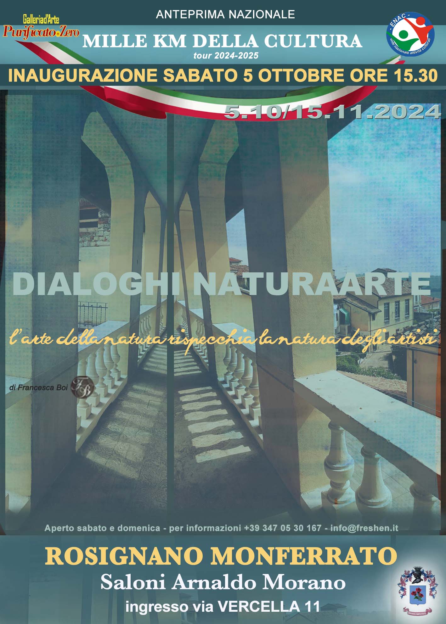 In occasione della manifestazione "Vendemmia in Arte" a Rosignano Monferrato, sabato 5 ottobre alle ore 15.30 ai Saloni Morano è in programma l'inaugurazione della mostra d’arte contemporanea “DIALOGHI NATURAARTE” - progetto e curatela di Francesca Boi, che rimane allestita fino al 15 novembre 2024.