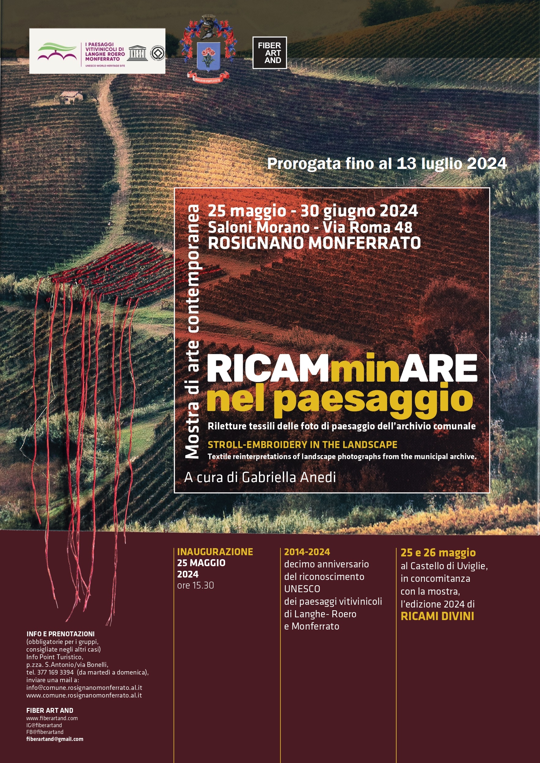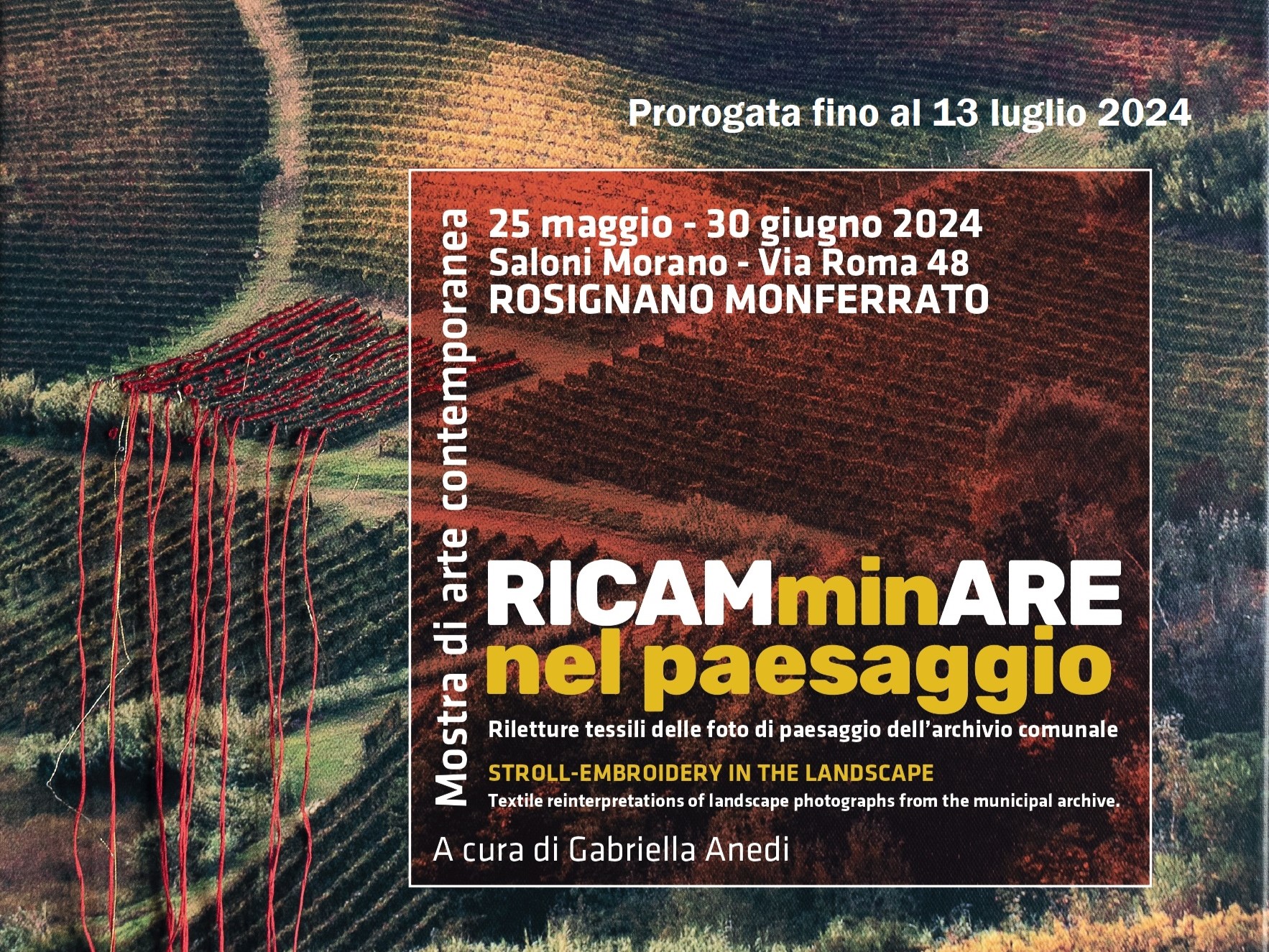 In concomitanza con la XXI edizione del tradizionale evento "Ricami Divini" sabato 25 maggio alle ore 15:30 è in programma l'inaugurazione della mostra di arte contemporanea "RICAMminARE nel paesaggio. Riletture tessili delle foto di paesaggio dell’archivio comunale", a cura di Gabriella Anedi in collaborazione con il Comune di Rosignano Monferrato. La mostra celebra il decimo anniversario del riconoscimento Unesco de "I Paesaggi Vitivinicoli del Piemonte: Langhe-Roero e Monferrato".
