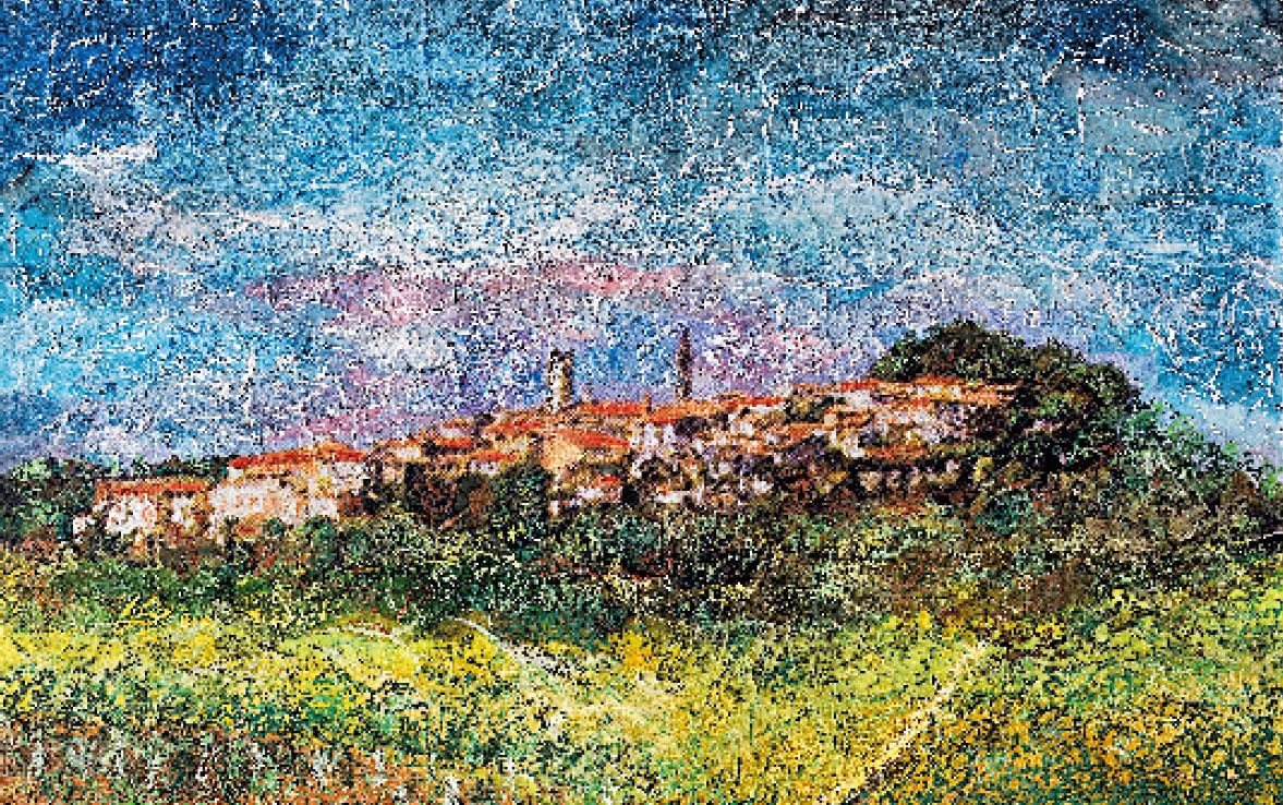 Nella mostra personale l'artista ha arricchito e approfondito il tema delle trasformazioni naturali e antropiche del nostro territorio, utilizzando su tela tecniche miste, collage, pittura e pastelli ad olio.