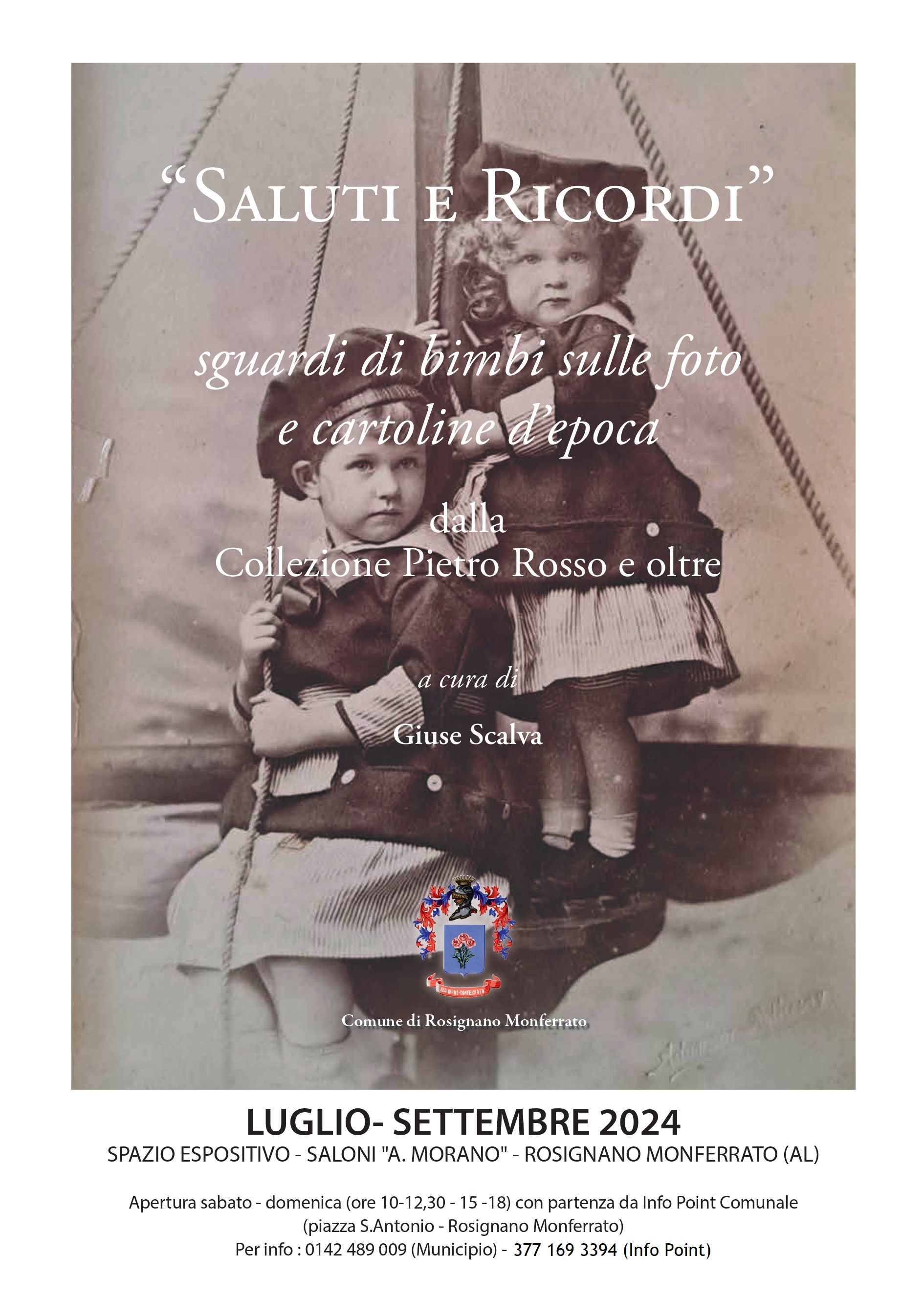 La mostra "Saluti e ricordi. Sguardi di bimbi sulle foto e cartoline d'epoca, dalla Collezione Pietro Rosso e oltre...", a cura di Giuse Scalva, nasce dal Fondo Fotografico Pietro Rosso - donato all’Archivio Storico comunale di Rosignano Monferrato dalla sorella Anita. Il Fondo rappresenta una fonte inesauribile e variegata di cartoline ed immagini d’epoca, soprattutto dedicate ai fanciulli di ogni parte del mondo, nazionalità e condizione sociale: uno spaccato singolare e rarissimo di vita e di sorrisi che giungono a noi da epoche e luoghi diversissimi.