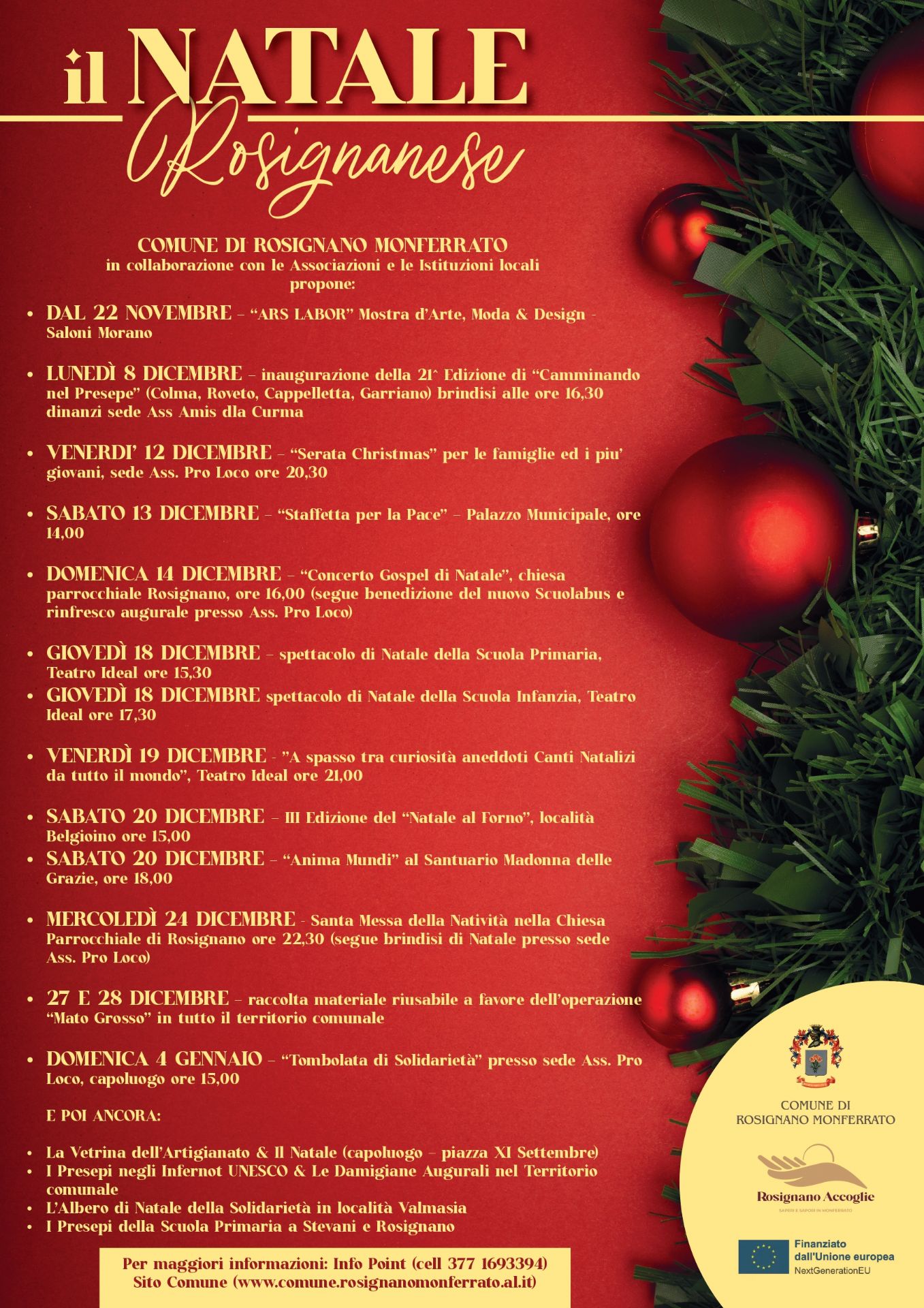 L’idea di “Camminare nel Natale” e di “Comunicare il Paesaggio Natalizio” nasce nell’ambito del Progetto Borghi finanziato dal PNRR “Rosignano Accoglie : Saperi e Sapori in Monferrato”