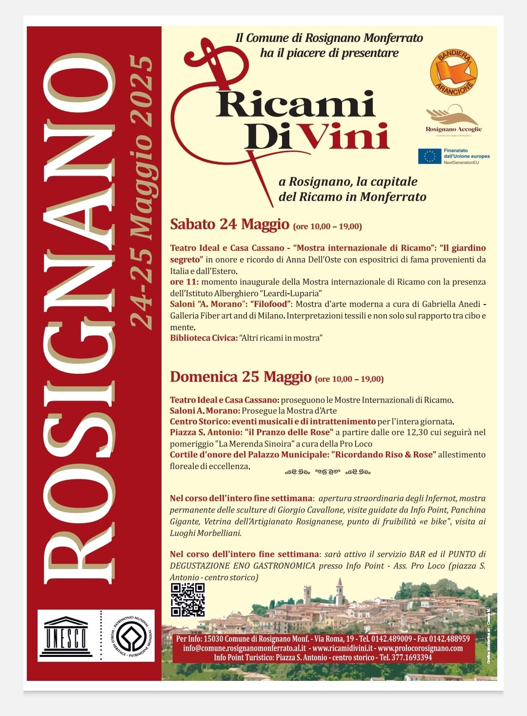 ...iniziative per scoprire il patrimonio culturale di Rosignano Monferrato e del suo territorio (info e prenotazione tel. 377 169 3394 - Info Point): dall’apertura straordinaria degli Infernot UNESCO con visite a cura dell'Info Point Turistico all’apertura della Mostra permanente delle sculture di Giorgio Cavallone, senza dimenticare la possibilità di visitare i Luoghi del pittore divisionista Angelo Morbelli – lo Studio a Villa Maria, in frazione Colma, ed il Percorso Morbelliano. La tradizione artigianale del Monferrato è valorizzata nella Vetrina dell'Artigianato rosignanese, aperta anche in occasione di Ricami DiVini. Per chi cerca un po’ di relax all’aria aperta, è disponibile il punto di fruibilità "e-bike" ed è possibile raggiungere la Panchina Gigante “Rosso Grignolino”, o percorrere l'intero territorio Rosignanese ricco di suggestioni uniche - il Percorso dei Trifulau, il Geo Percorso, il Museo Contadino Diffuso, etc.