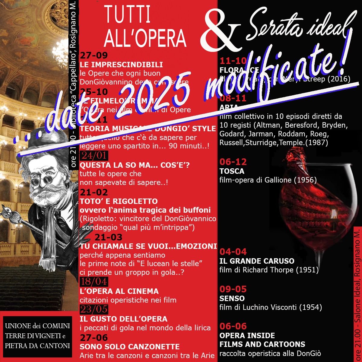 La rassegna "Tutti all'Opera" si tiene presso la Biblioteca Cappellaro di Rosignano Monferrato alle ore 21 con il seguente programma che si sviluppa nel periodo ottobre 2024-giugno 2025 (per maggiori informazioni si rimanda alla locandina allegata):