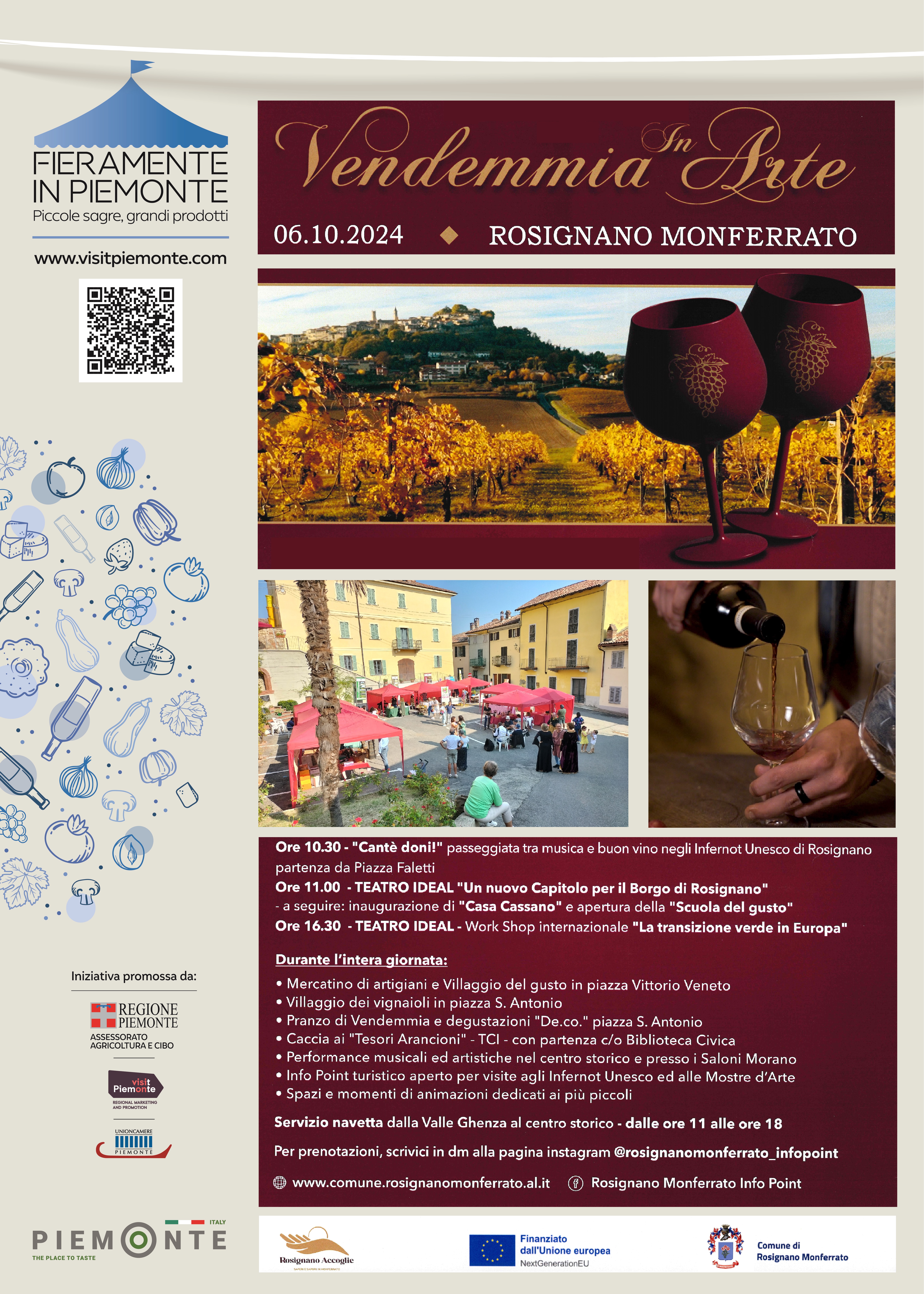 Per l’edizione 2024 di Vendemmia in Arte il Comune di Rosignano Monferrato ha aderito anche al progetto “Fieramente in Piemonte, piccole sagre grandi prodotti”, a cura di Regione Piemonte - Assessorato Agricoltura e cibo e Visit Piemonte.