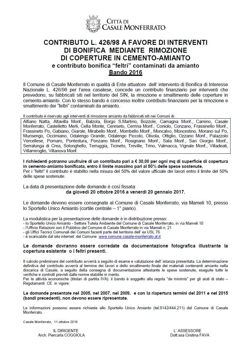 CONTRIBUTO L. 426/98 A FAVORE DI INTERVENTI DI BONIFICA MEDIANTE RIMOZIONE DI COPERTURE IN CEMENTO-AMIANTO E CONTRIBUTI BONIFICA "FELTRI" CONTAMINATI DA AMIANTO